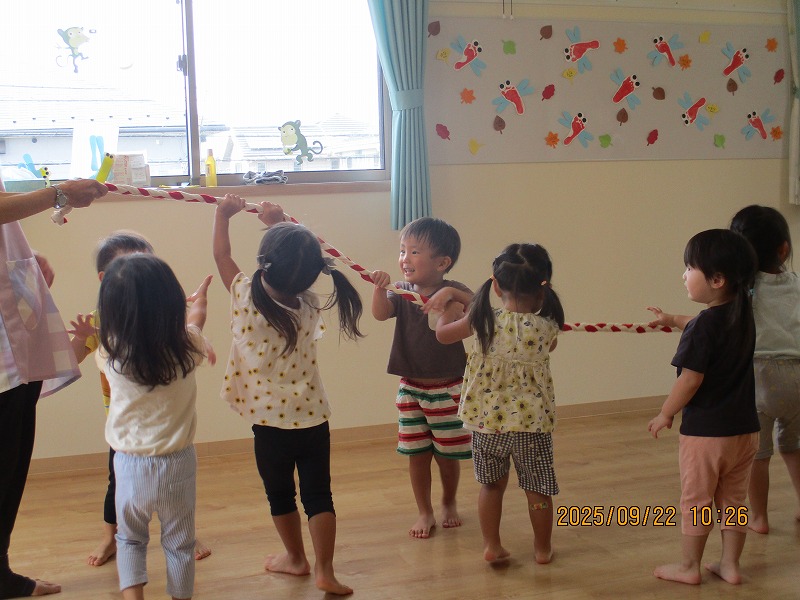 編んだ縄を使って色々な遊びをしました。最初に手綱に見立てて荒馬踊り、それから綱引き、縄跳びと続きます。「ラッセラーラッセ...>続きを見る
