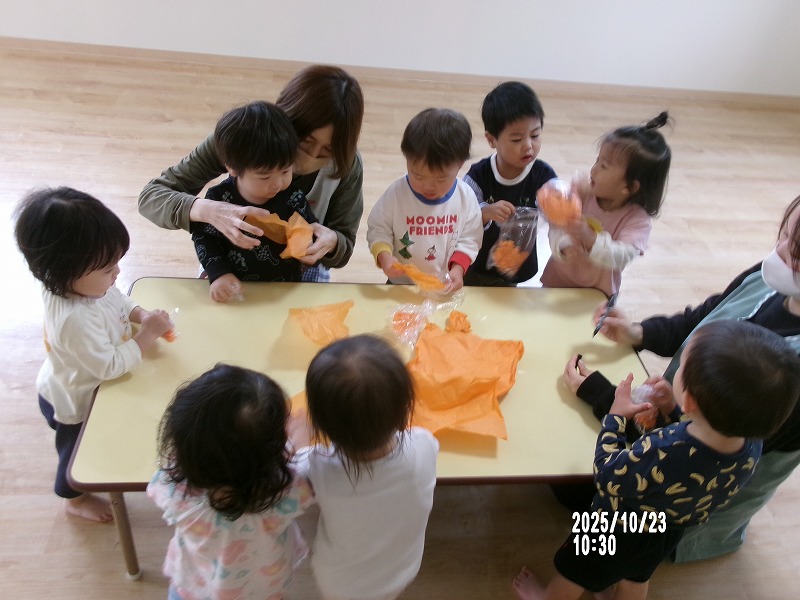 今月末はハロウィン‼子どもたちは散歩先のハロウィン飾りに「みて〜!」「あった!」と毎日目を輝かせています。そして、今日はハロウィン製作をしました。玄関に飾ってあるジャック・オー・ランタンを机に持ってくると大興奮⁉「みんなで作ってみようか!」と言うと「つくる〜!」と良い笑顔でした。ビニール袋にオレンジ色の花紙を詰め込みます。ぎゅっぎゅっと丸める子、ふんわり丸める子、色々な大きさのジャック・オー・ランタンが出来ました。完成した製作と一緒にみんなでハロウィンを楽しみたいと思います(^^♪