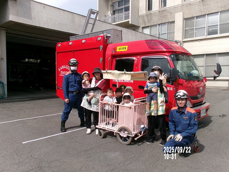 今日は、心地よい秋風が吹き、絶好のお散歩日和‼久しぶりに消防署までお散歩に行ってきました。「ピーポーいるかな?」「バスも見られるかな」と嬉しそうな子どもたち。到着すると、ちょうど隊員の方が消防訓練をしているところでした。「中に入って見ていって下さい」と嬉しい声を掛けていただき、すぐ近くで見られることに!2階ほどの高さまではしごでスイスイ登る姿に釘付けな子どもたちでした。そして、最後に記念写真も撮り、とても貴重な体験が出来ました。子どもたちも楽しかったようで、隊員の方の姿が見えなくなるまで「バイバ〜イ!」と手を振っていました(^^♪