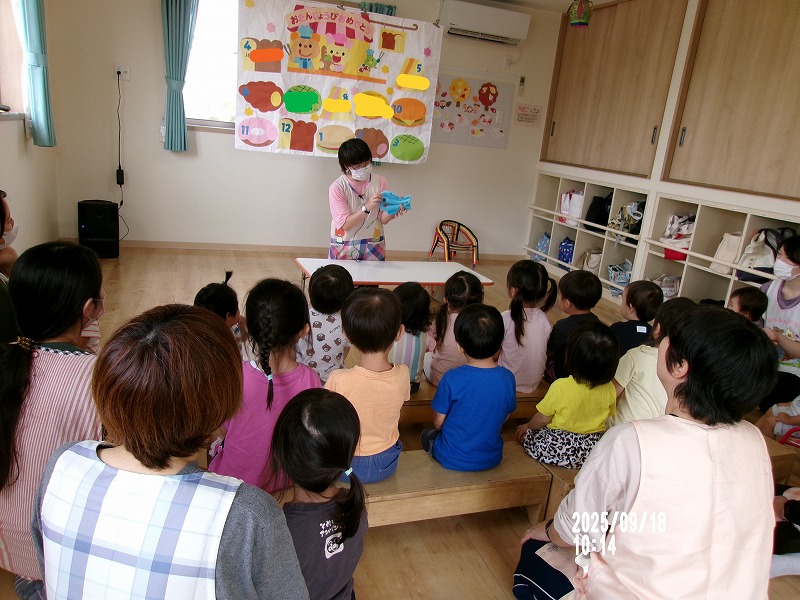 今日は、9月のお誕生日会を行いました。主役は4人!つくしグループのYちゃん。たんぽぽグループのRくんとHちゃん。ちゅーりっぷグループのMちゃんです。好きな遊びや食べ物を担当の保育者より紹介してもらいました。Yちゃんは、あちこち歩くのを楽しんでいて、おかゆが大好き。Rくんは、お母さまも参加されていたので、お母さまに伺うと、ブロックがたくさん積めるようになり、小麦で出来たものをよく食べるそうです。Hちゃんは、シール貼りが好きで、くだものが好き。Mちゃんは、歌遊びが好きで、カレーライスが好きとの事でした。次にカードと歌のプレゼントが終わると、ケーキが登場。ロウソクに火をつけると、ドキドキの表情の子どもたちでした。4人で頑張ってロウソクの火を消そうとしましたが、なかなか消えなかったので、ちゅーりっぷグループのお友だちに手伝ってもらいみんなで吹き消すことが出来ました。保育者からの出し物は「バケバケおばけちゃん」と「みんな何かのチャンピオン」でした。どの出し物も、子どもたちみんなが参加し楽しそうに見ていました(^^♪