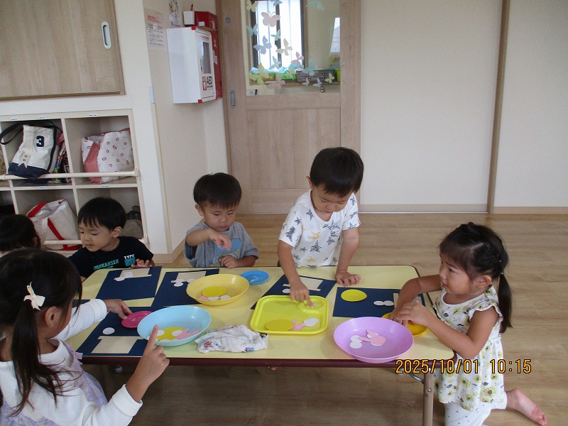 10月6日は十五夜です。園でもおだんごを飾ってお月見会をします。その時に一緒に飾るお月見製作をしました。まず「おつきさまこんばんわ」の絵本を見ました。大きな月をじっくり見ていた子どもたちです。その後、藍色の台紙に、おだんご、月、うさぎをのりで貼っていきました。「どこに貼ろうかな?」「ここにしよう!」「ほら見て〜!」とどの子も集中して取り組んでいました。完成すると、嬉しそうに見せ合っていました(^^♪