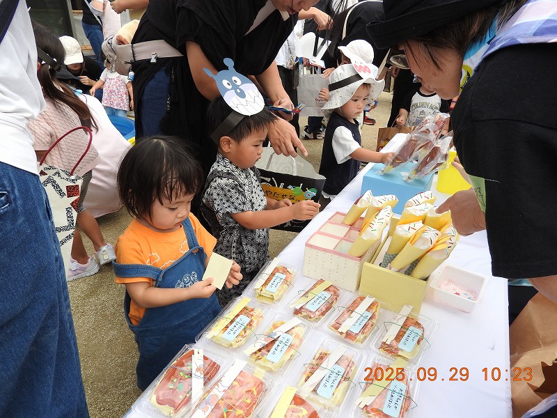 今日は、子どもたちが首を長くして待っていたすみれっ子まつり‼パパやママ、おじいちゃん、おばあちゃん、そしてルンビニ幼稚園のお友だち、総勢90人もの方々が参加してくれ、とてもにぎやかな雰囲気となりました。まずは、歌遊び「たいやき たこやき」「焼いもグーチーパー」を元気いっぱい歌いました。そして、次は、みんなが大好きな荒馬座公演が始まりました。今日の演目は「水口春祭り」「獅子舞」「ソーラン節」「荒馬踊り」の4つです。どれも素晴らしいものばかりで、子どもたちもダイナミックな太鼓の音に喜んだり、篠笛の音色にパチパチ手を叩いたりしていました。最後の「荒馬踊り」では、みんなが縄をも持ち、「ラッセラー」と元気に掛け声をかけながら一緒に跳ねることが出来ました。おまつりの後半は、お店屋さんごっこもしました。魚釣りやヨーヨーすくい、お面屋さん、お好み焼きやチョコバナナ、クレープなどの食べ物屋さん、ボーリングのピンを倒すと景品がもらえる、おばけボーリングなどをお家の方と楽しむ姿が印象的でした。そして、終わりが近づくと本物の「かき氷屋さん」も登場⁉「冷た〜い!」「おいし〜!」とたくさんの笑顔があちこちで見られ、和やかな雰囲気の中で無事、すみれっ子まつりを終えることが出来ました(^^♪