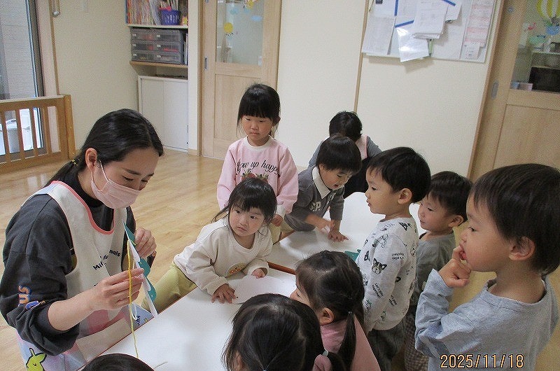 今日はクリスマス製作、ツリーを作りました。まずは用意してあったツリーにシールを貼り、飾り付けです。手先がとても器用になっ...>続きを見る