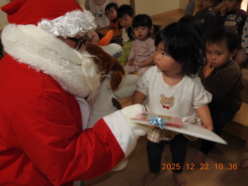 ちゅーりっぷグループのキャンドルサービスから始まりました。「ああもみの木」の歌と共に一列に前に並び、そして、テーブルの上のキャンドルに1本1本火がつけられると、子どもたちは静かにそれをじっと見つめていました。次は一転、クリスマスの歌をみんなで元気に歌いました。その後は子どもたちの製作の紹介です。ちゅーりっぷグループはサンタさんにに目や口を貼り、もみの木に、ひも通しとシールで飾りつけをしました。たんぽぽグループは、リースにシールを貼って、色とりどりに仕上げました。つくしグループは手形をトナカイの角にして、かわいらしい帽子を作りました。1つひとつの作品がキラリと個性の光る素敵なものになりました。保育者からの出しもの、1つ目は「カレーライスの歌」。みんで歌いながらお鍋にお肉や野菜など材料を入れていきました。おいしそうなカレーが出来上がると「うわぁ〜!」とみんな嬉しそうでした。2つ目は劇と踊りの「お寝坊サンタ」。「たのし〜い⁉」と言いながらサンタとトナカイに扮した保育者の踊りを笑顔で見ていました。さあ、いよいよ本物のサンタさんの登場です。最初は驚いていた子どもたちでしたが、優しい表情に、どの子も緊張しながらも落ち着いてプレゼントを受け取ることができました。また、来年も、園にサンタさんが来てくれますように・・・(^^♪