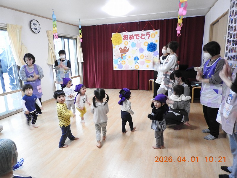 待ちに待った新年度がスタートしました。今日は、新しいお友だち7名を迎えての入園進級式です。1人ずつ名前が呼ばれると、元気よく「ハイ!」とお返事していました。みんなで春の歌を歌うと、部屋にも春の心地よい風が流れてきて、笑顔がたくさんあふれていました。保育者からのお祝いの出し物は、子どもたちが大好きな「忍者のはやととおそと」。見た後は、頭に頭巾をかぶって忍者になりきり、部屋をかけまわりました。新しいお友だちと一緒に、一年間、楽しく過ごしていきたいと思います(^^♪