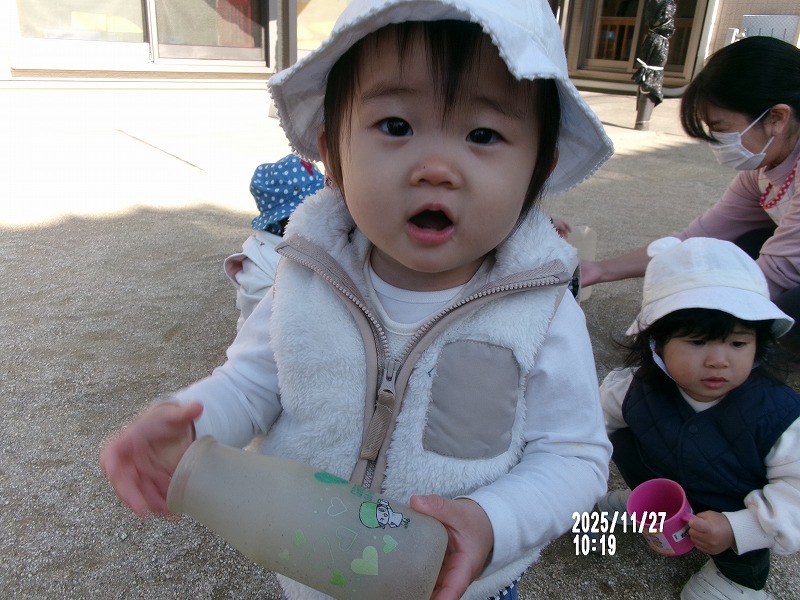 日中はあたたかい日差しが顔をだし絶好のお散歩日和です。たんぽぽさんとちゅーりっぷさんが公園に出発する様子を見送ったので、つくしさんたちもお外へ行くのが楽しみなようで自分の帽子やベストを見つけて喜んで手にとっていました。お散歩では保育者と1人ずつ手をつないで歩いてみました。しっかりと保育者の手を握り返してくれて安定して歩くことができました。保育園に帰ってからは、園庭におもちゃを用意すると集中してお砂遊びを楽しんでいました(^^♪