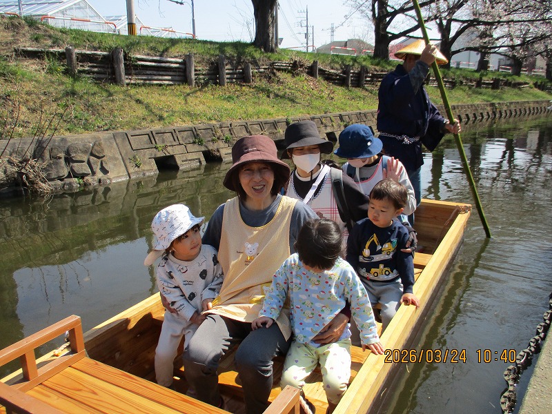 今日は、つくし、たんぽぽ、ちゅーりっぷグループみんなで桜を見に行こうと出発しました。橋を渡った先で足を止め川沿いの桜を「きれいだね」と言いながら見ていると、ゆっくり進む船を見つけました。子どもたちは「お〜い!」「がんばってね!」と手を振りながら声を掛けていました。それを見ていた船頭さんより「乗りますか」と声を掛けていただき、順番で乗らせて頂きました。船から桜を見上げる景色はいつもと違って格別で、みんなとても喜んでいました(^^♪