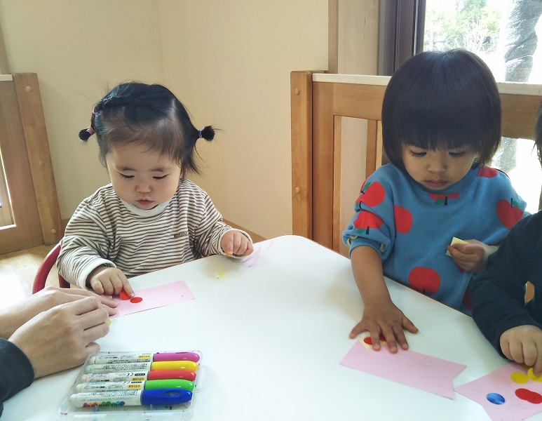 あたたかく気持ちの良いポカポカ陽気と共に新年度がスタートしました。新しい環境でちょっぴり緊張した子どもたちでしたが、あっという間に慣れて、毎日お友だちと一緒に楽しく過ごしています。今日は、今年度はじめての製作をしました。クレヨンと丸シールを用意すると、進級した子どもたちは”ちょうだい!”と手をだしてアピールして、自由にお絵描きしたりシールを貼って楽しんでいました。その様子を見ていた新入園の子どもたちも、おそるおそる手を伸ばして最初は”こうかな?”とクレヨンで描いていましたが、楽しくなってくると夢中で画用紙に描いていました。シールも上手に貼れて「できた!」と嬉しそうに見せてくれる子もいました(^^♪