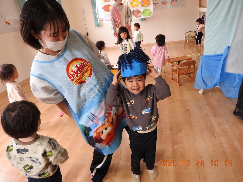 次は誕生日会です。3月生まれのお友だちは、たんぽぽグループのIくんとちゅーりっぷグループのTくんの2人。お家の方も参加してくださり一緒にお祝いをしました。Iくんは、食べ物では「いちご」が好きで、好きな遊びは「くるま」だそうです。お家でもずっと車で遊んでいますと教えてもらいました。Tくんは「ひじき」や「プチトマト」が好きで、好きな遊びは「トミカ」や「プラレール」だそうです。そして、カードや歌のプレゼント、ケーキ登場でロウソクの火を「ふぅ〜っ!」と吹き消しました。保育者の出し物は「クマさんの魔法のエプロン」というエプロンシアターと、「みんなきたよ!ハッピーバースデー」というペープサートでした。どの出し物も、みんな楽しそうに見ていました(^^♪