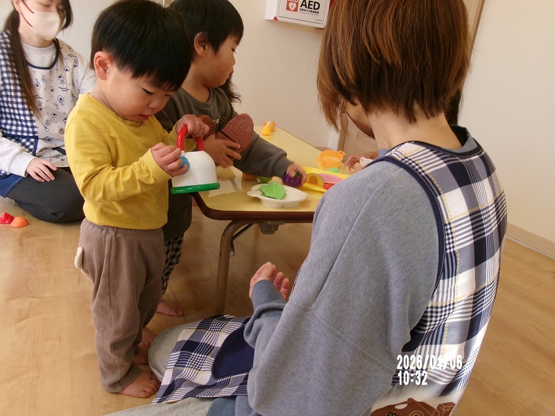 新年度がスタートし、年末年始のお休み明けのお友だちとの再会に嬉しそうな子どもたち。たんぽぽさん(1歳児)は、今月から新しくお友だちを迎え9人になりました。初めは泣いていた「Iくん」も早くも園生活に慣れ始め、お友だちと目が合うとニコニコする姿もみられるようになりました。また、お散歩も好きなようで「歩きたい!」と伝えてくれます。ますます寒さが増す日々ですが、天気の良い日にはお散歩へ行き、みんなで元気に過ごしたいと思います(^^♪