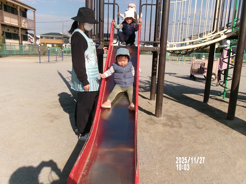 小春日和になった今日、氷川町公園へ行ってきました。片道25分の道中、「すべり台あるかな?」「ブランコのりたいな!」とワクワク楽しそうな子どもたち。着くと一斉に思い思いの遊具へ走っていきました。1番人気はアスレチック風のすべり台。階段だけでなく、丸太のハシゴやロープをつたって上っていく子もいて、力強さやたくましさを感じさせてくれました。ブランコ乗りでは、両手でしっかりつかまりながら揺らしてもらって、「見て〜!」「気持ちいい〜!」と笑顔がはじけます。みんなそれぞれがお友だちとおしゃべりしながら、体をいっぱい動かし遊びました。帰り道はお弁当の話で盛り上がり、食べるのを楽しみに帰ってきました(^^♪