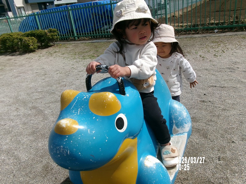 昨日の雨模様がウソのように今日は快晴でお出かけ日和。草花も元気いっぱいで公園に向かう途中に見つけた子どもたちが「はっぱ!」「お花!」と指をさして嬉しそうに眺めていました。目的地の公園が見えてくると「わぁ〜‼」と目をキラキラ輝かせ、ワクワク・ソワソワと早く遊びたい様子。到着し散歩車から降りると、たったか走ってすべり台やスプリング遊具をお友だちと一緒に楽しんでいました。ちゅーりっぷ・たんぽぽグループのお兄さんお姉さんたちもいたからか、より活発にあちこち動いて公園を満喫していました(^^♪
