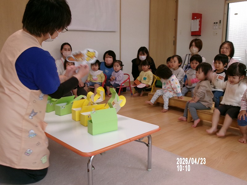 今日は、4月生まれの誕生日会を行いました。主役は、たんぽぽグループのYちゃんです。お母さまも参加されてニコニコ顔のYちゃんにまずはインタビューしてみました。「お名前を教えてください?」「何歳になりましたか?」いつもはお名前を教えてくれるのですが、みんなの前に座ると緊張してしまったので、お母さまに教えていただきました。Yちゃんの好きな食べ物は、炊き立てのご飯で、好きな遊びは、手遊び歌や追いかけっこだそうです。次に、カード、歌、ケーキのプレゼント。ケーキのロウソクに火が灯ると、Yちゃんは一生懸命に息を吹きかけ、一人で吹き消すことができました。保育者の出し物の一つ目はポケットポシェットシアター、「ふしぎなポケット」。二つ目はペープサート、「さんぽ」で散歩でした。どの出し物も、子どもたちは楽しそうに見ていました(^^♪