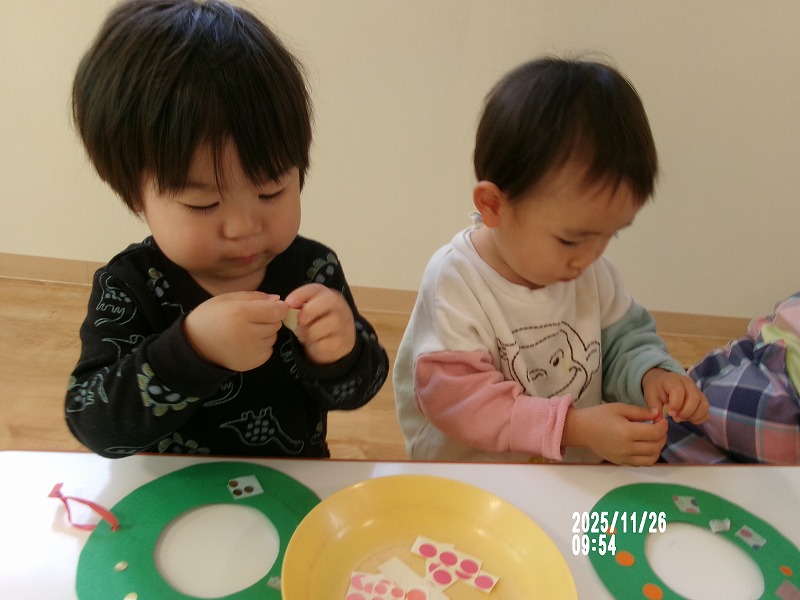 今日はクリスマス製作でリースを作りました。マスキングテープと丸シールをリースに貼り飾りつけをしました。保育者の見本を見ると「やりたい!」「ペッタンする!」と目をキラキラさせるたんぽぽさん。細長いテープをたくさん貼る子、丸シールをたくさん貼る子、キラキラの金のシールを「キラキラ‼」と嬉しそうに貼る子。小さなシールも上手に土台から取って貼れるようになり、それぞれ素敵なリースが完成しました(^^♪