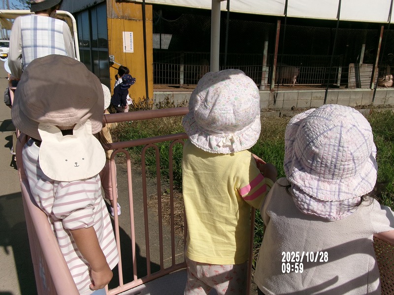 今日は、芳野の養豚場へ行ってきました。ちゅーりっぷさん(2歳児)の足で片道40分。途中の田んぼ道ではつないだ手を離し、自由に歩いたり走ったりしました。遠くにブタさんの姿が見えてくると「あ〜!」「いた!」「大きい‼」「うごいてる⁉」と興奮気味の子どもたち。近くまで行ってみると、とても大きな丸々太ったブタさんたちが出迎えてくれました。「黒いブタさんもいるね!」「しっぽがクルクル」と、みんなじっくりと観察していました。麦茶を飲んでから、帰りはたんぽぽさん(1歳児)も順番で元気よく歩いてきました(^^♪