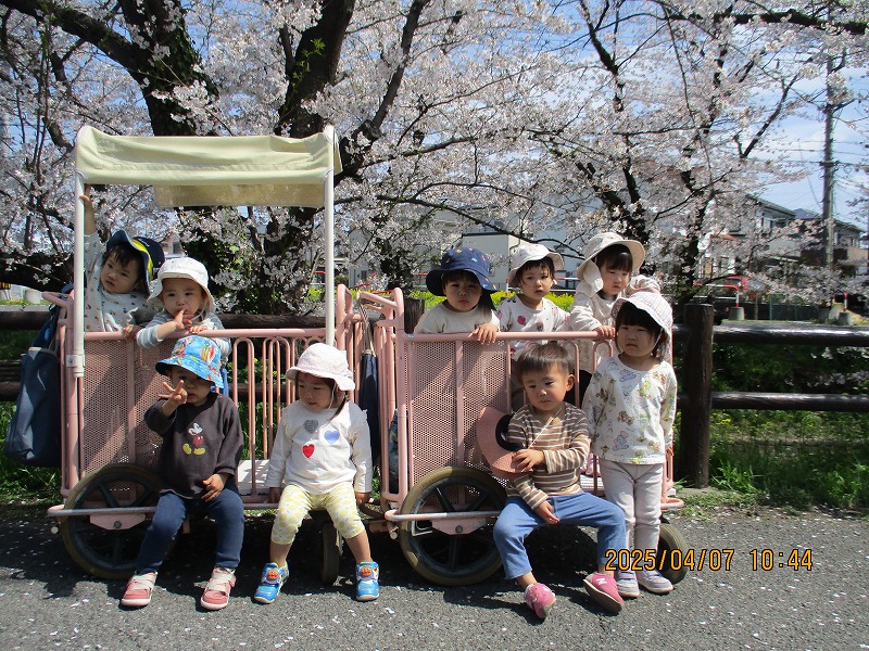 今日は、ちゅーりっぷグループ(2歳児)とたんぽぽグループ(1歳児)のSくんと川沿いまでお散歩に行き、満開の桜を見てきました。ピンクの桜に黄色の菜の花、そこにヒラヒラと蝶々が飛んでいたり、周遊も見えます。子どもたちは「お花きれい!」「ちょうちょが飛んでいるよ!」と言ったり、すれ違う方たちが「かわいいね」と声をかけてくださったので、それに答えるように「バイバ〜イ」と手を振ったり「こんにちは!」と挨拶している子もいてとても可愛かったです(^^♪